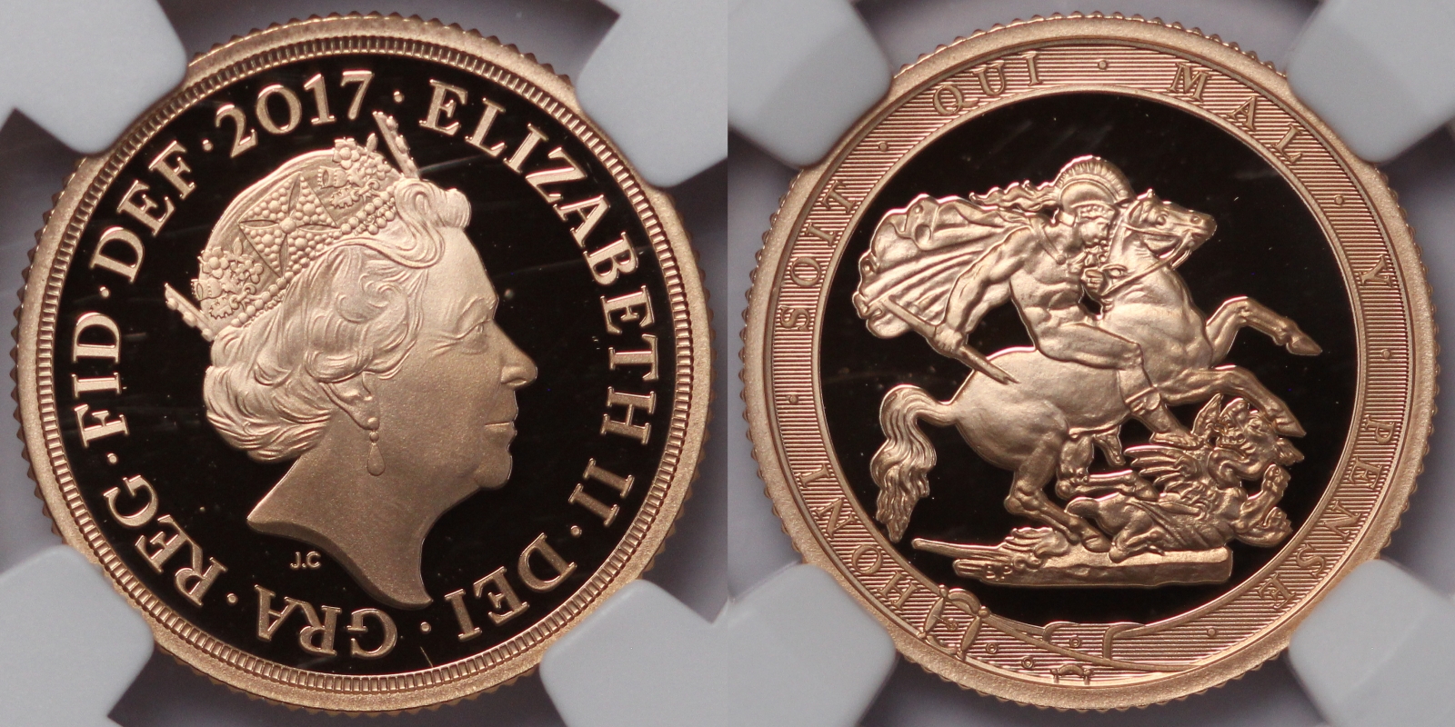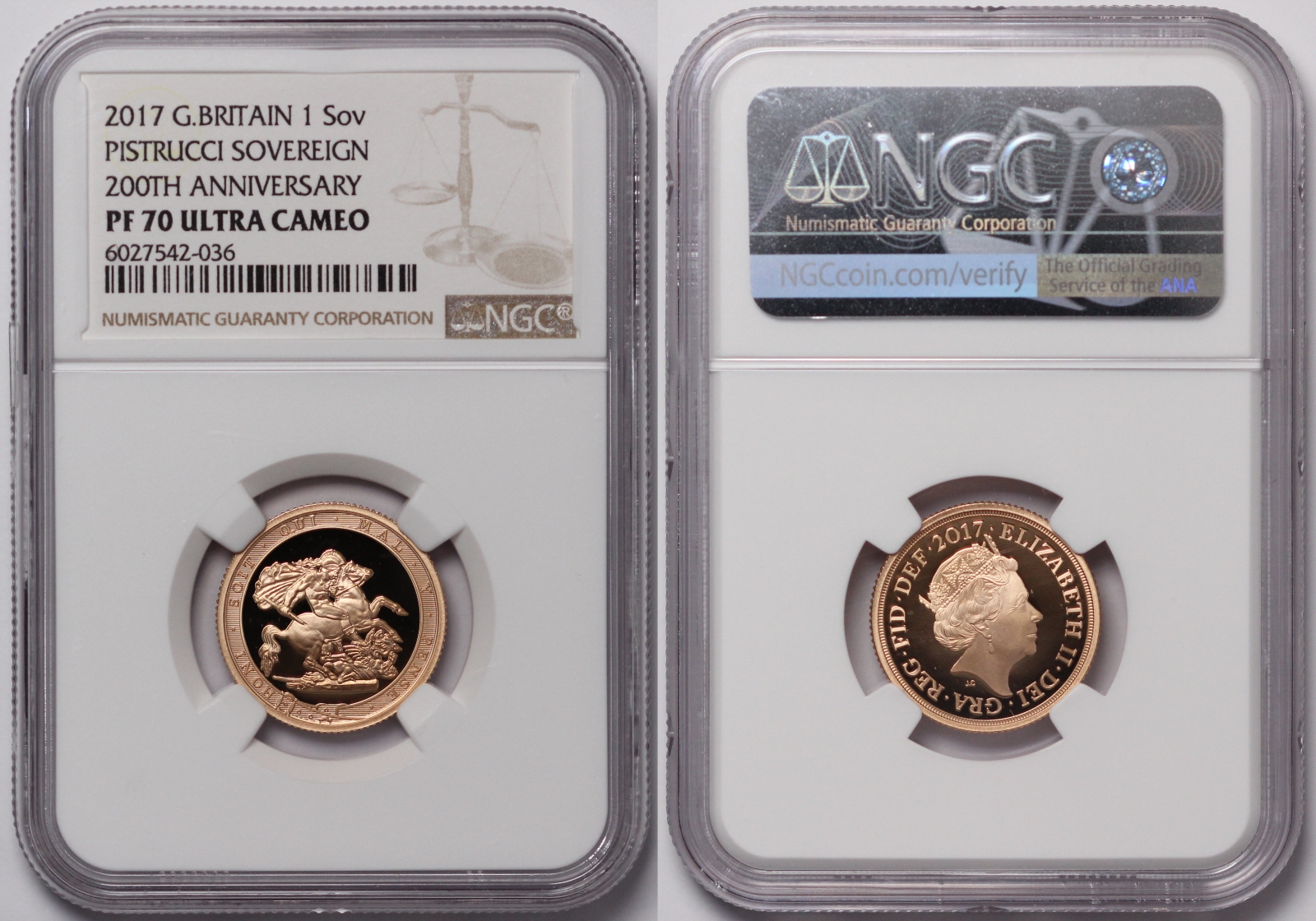Great Britain 2017 Proof Sovereign – Pistrucci Sovereign 200th anniversary commemorative. A popular one-year only issue. NGC graded Proof 70 Ultra Cameo.