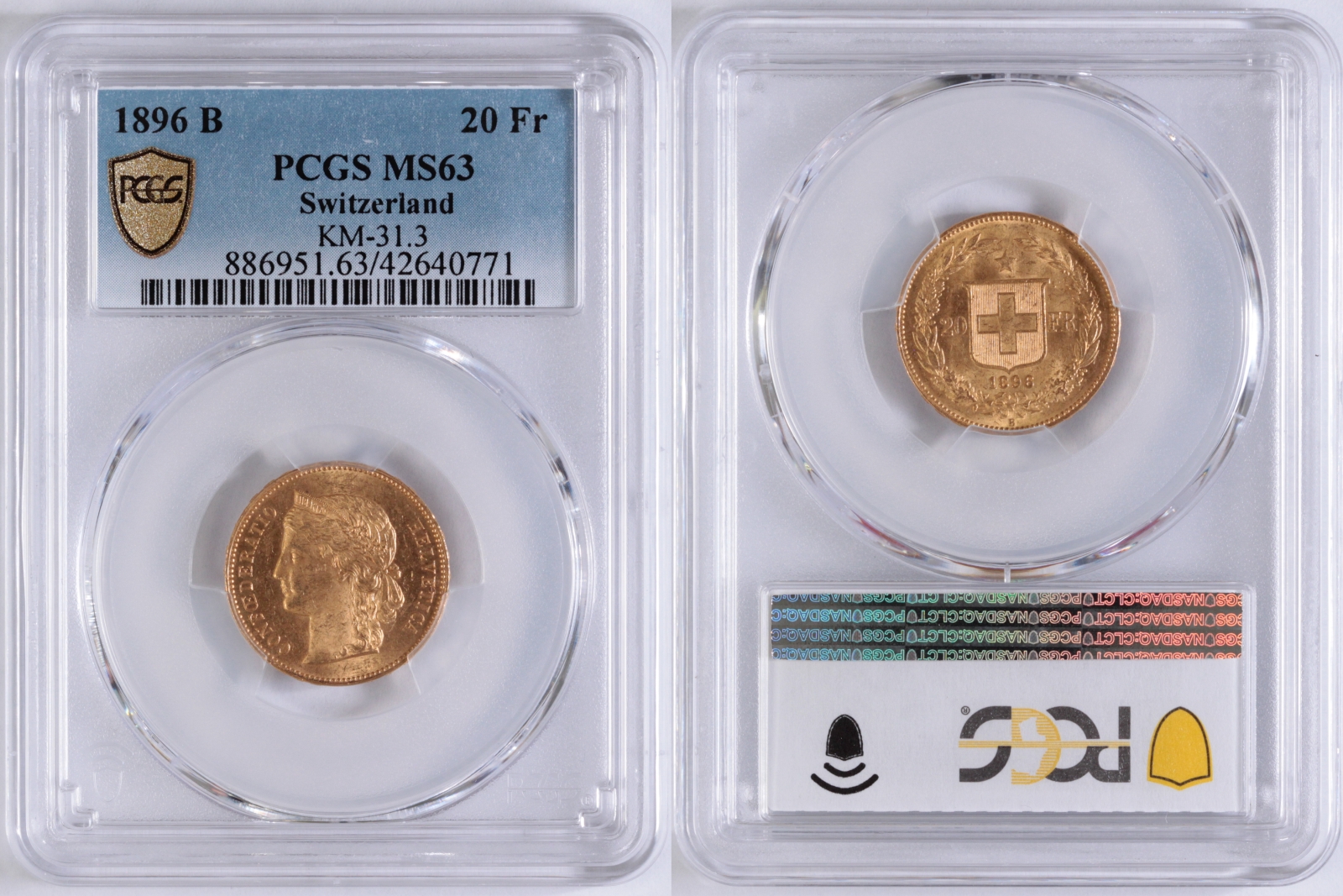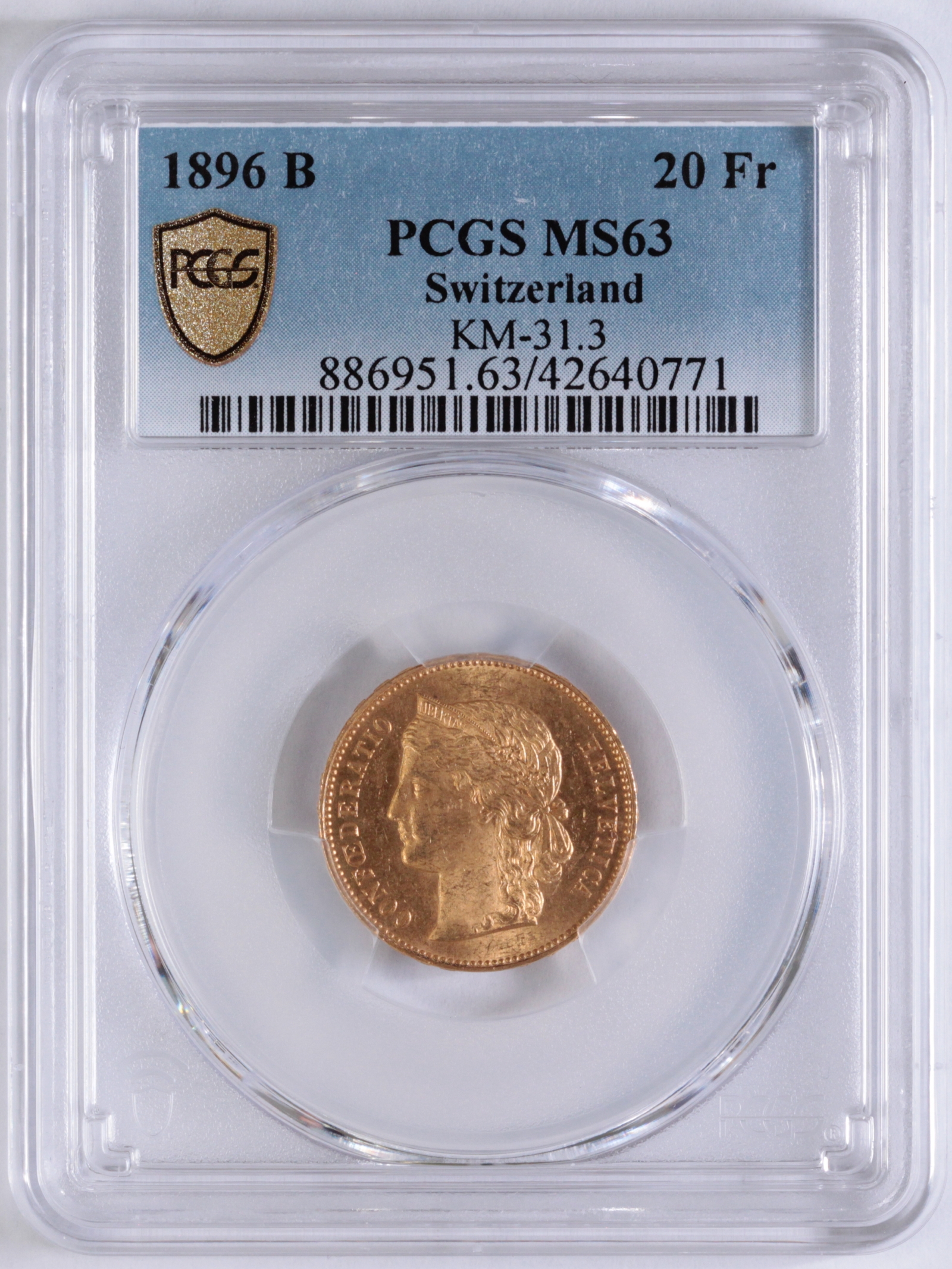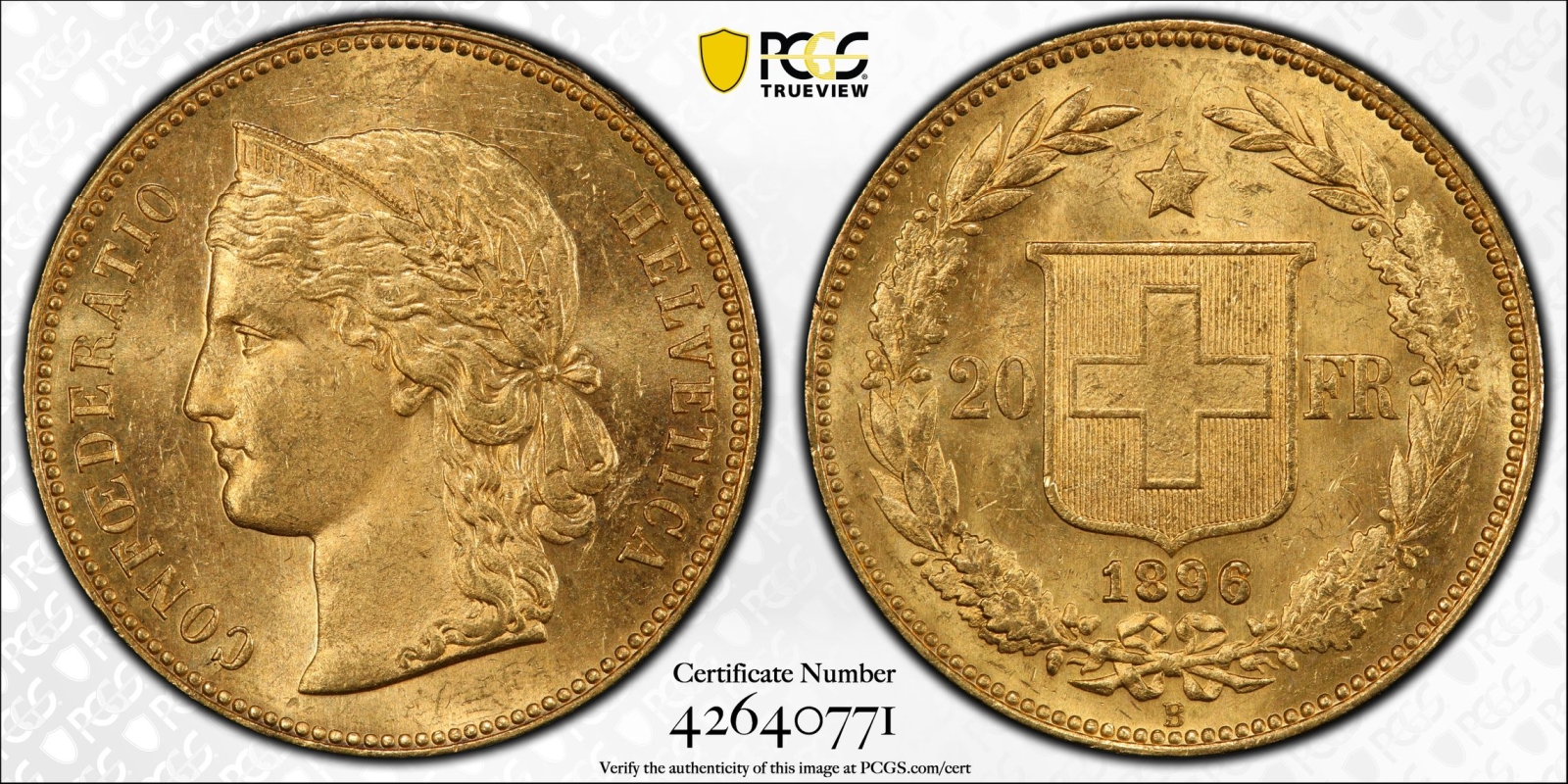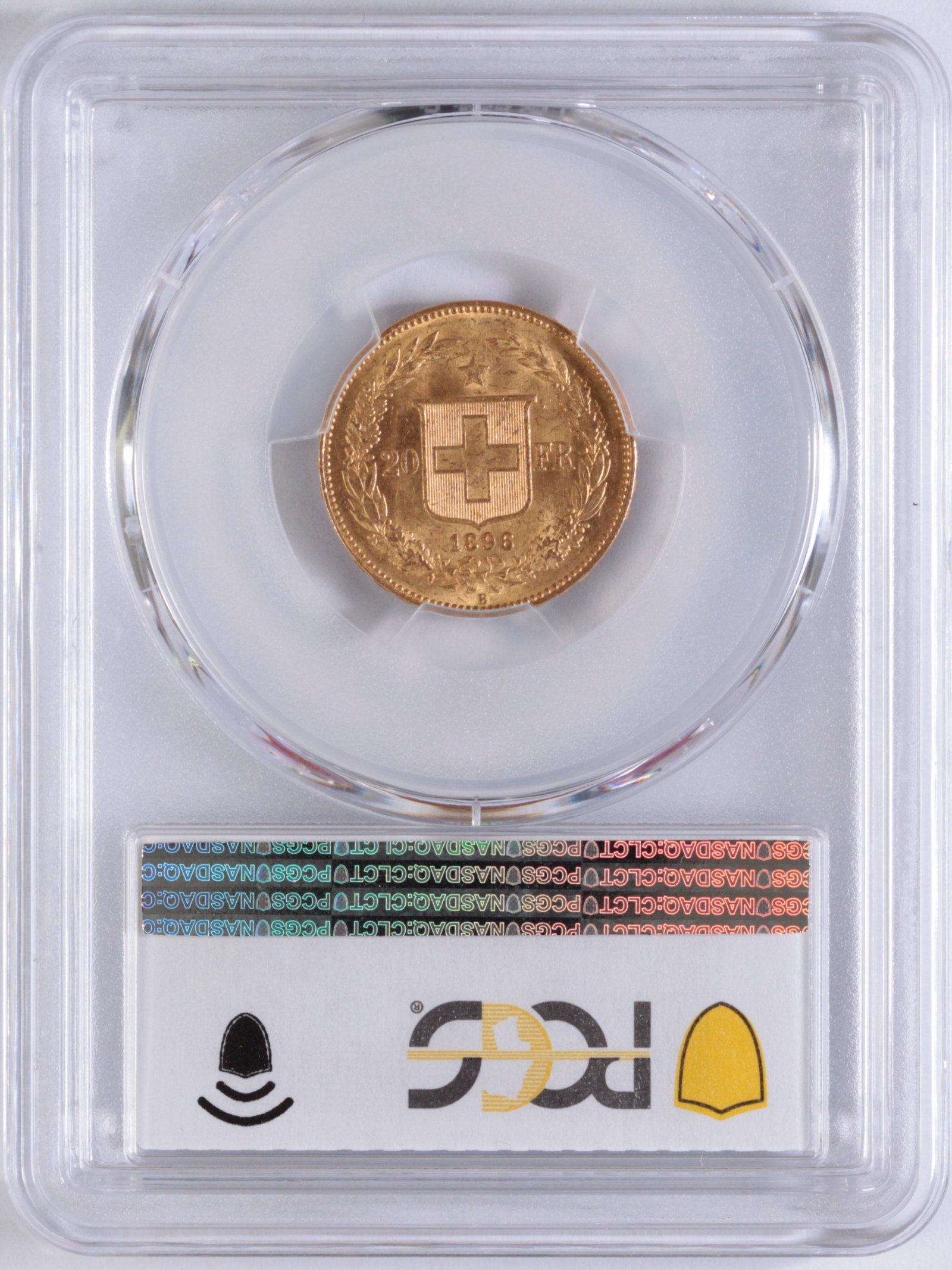 SWITZERLAND. 20 Francs, 1896-B. KM-31.3. PCGS graded MS63 Choice Uncirculated.