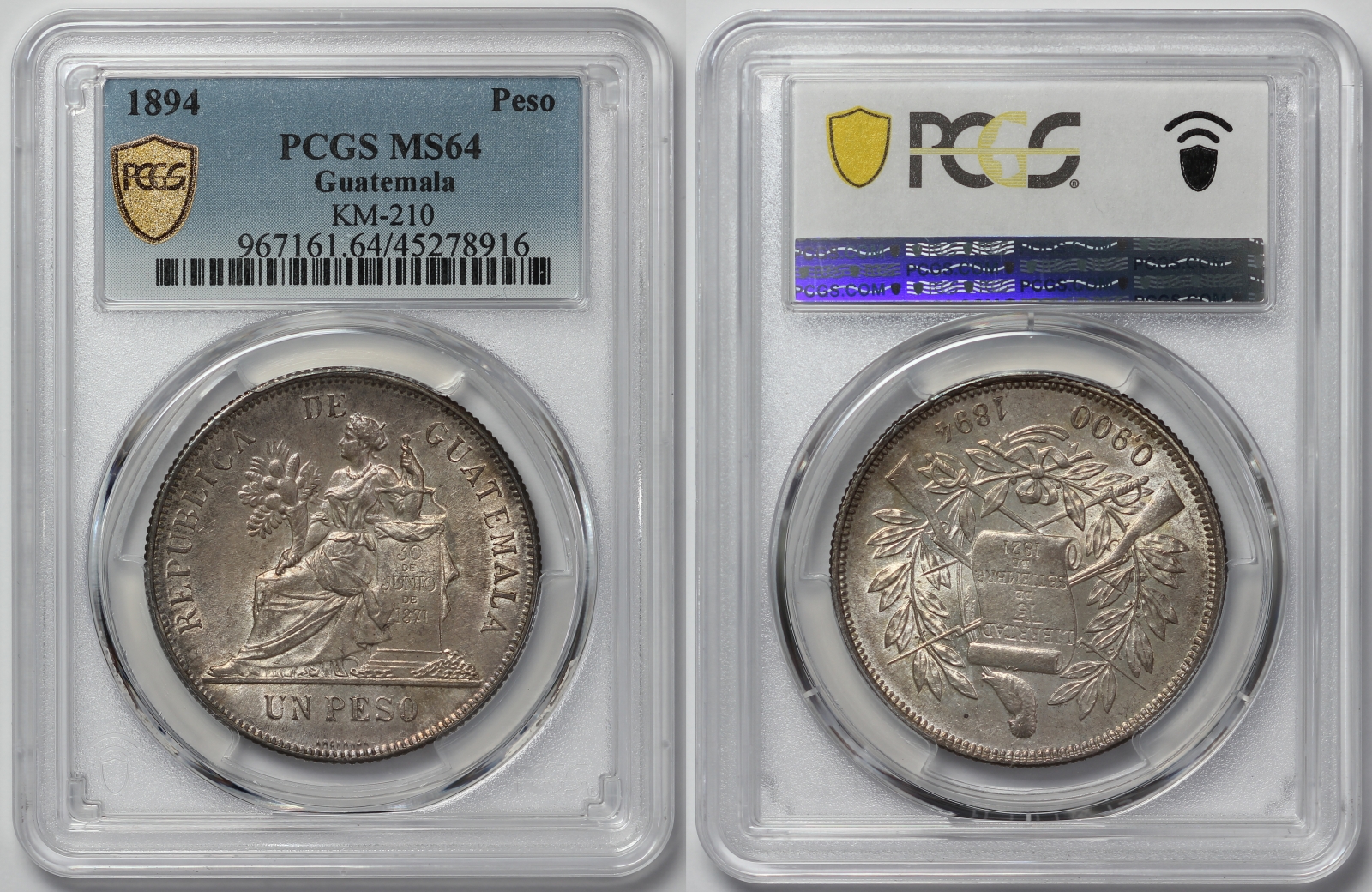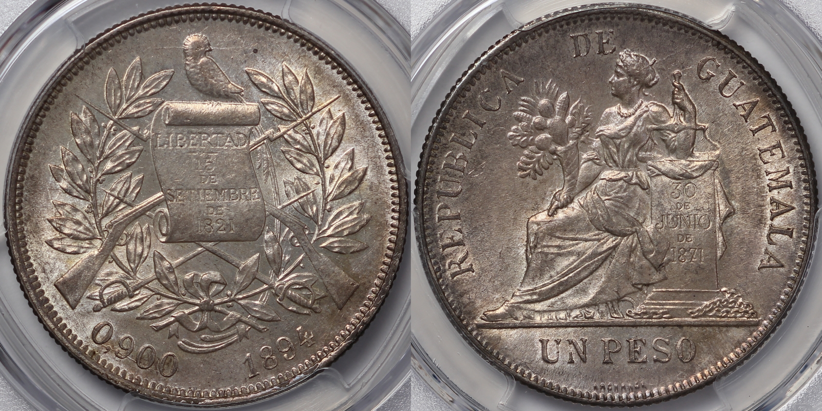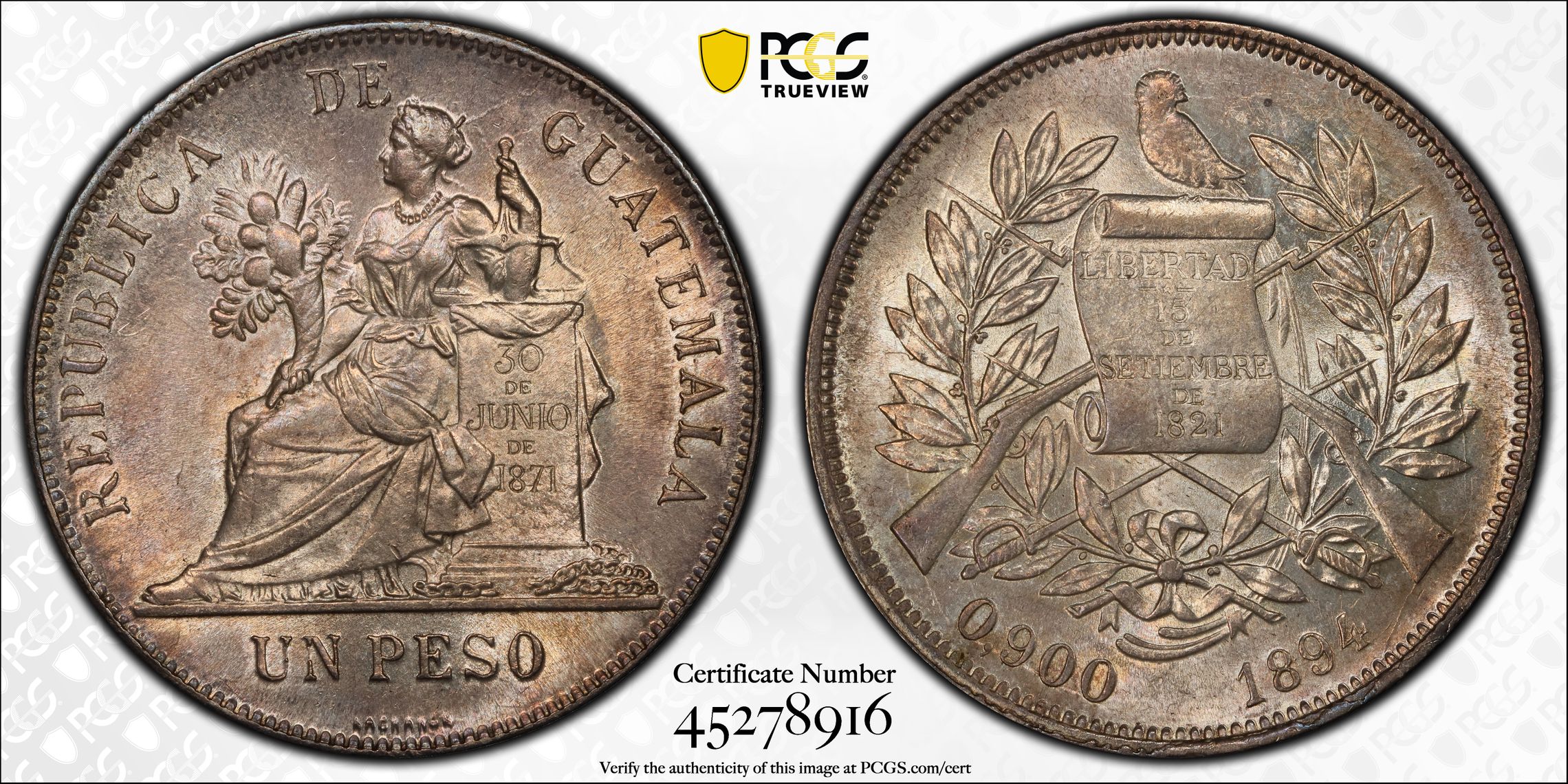GUATEMALA. Peso, 1894. Guatemala City mint. KM# 210. PCGS graded MS64.