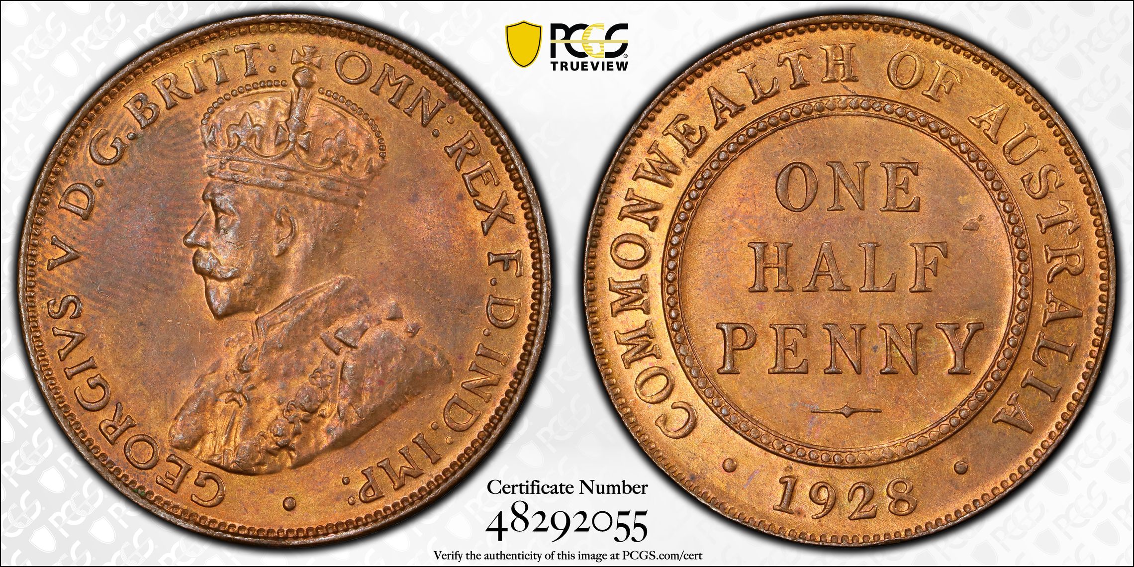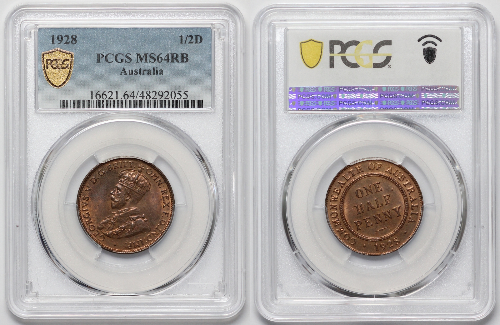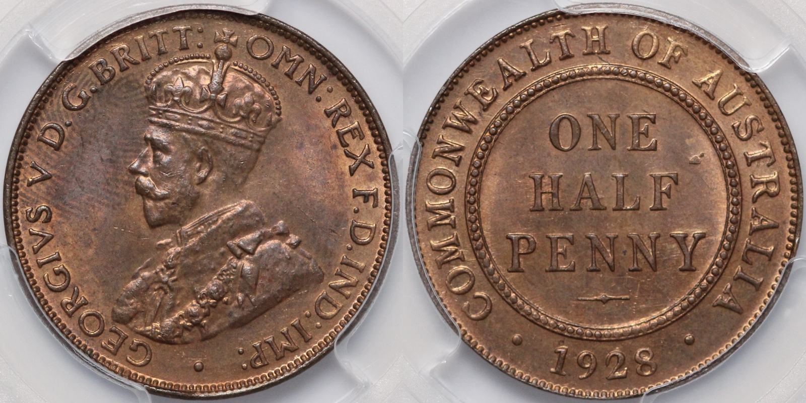 Australia 1928 Halfpenny 1/2D, PCGS graded MS64RB Choice Uncirculated Red-Brown. Equal-second finest graded by PCGS, only two graded higher in a plus grade (Pop: 4/2).
