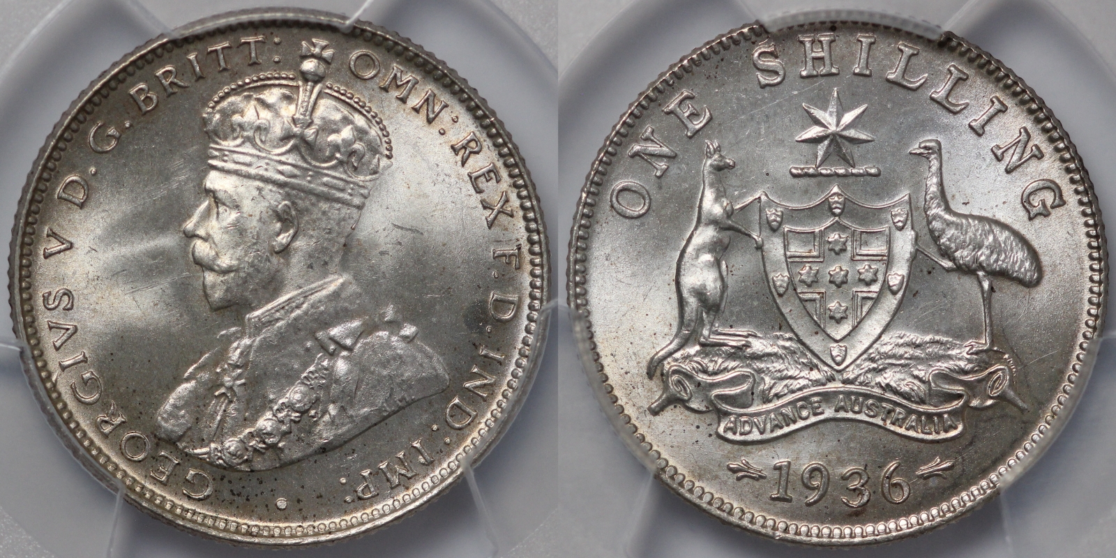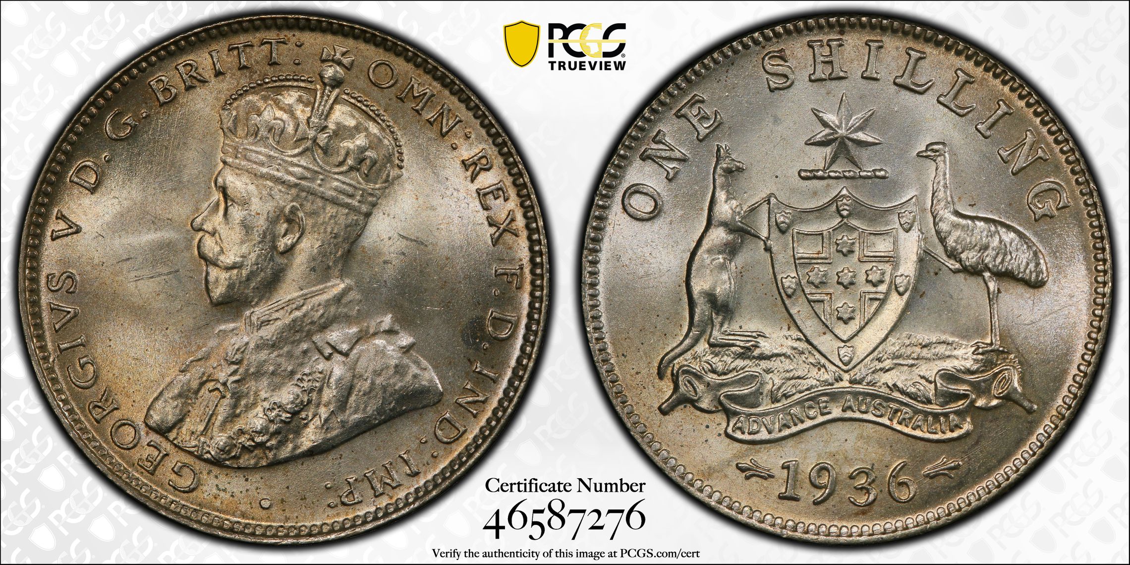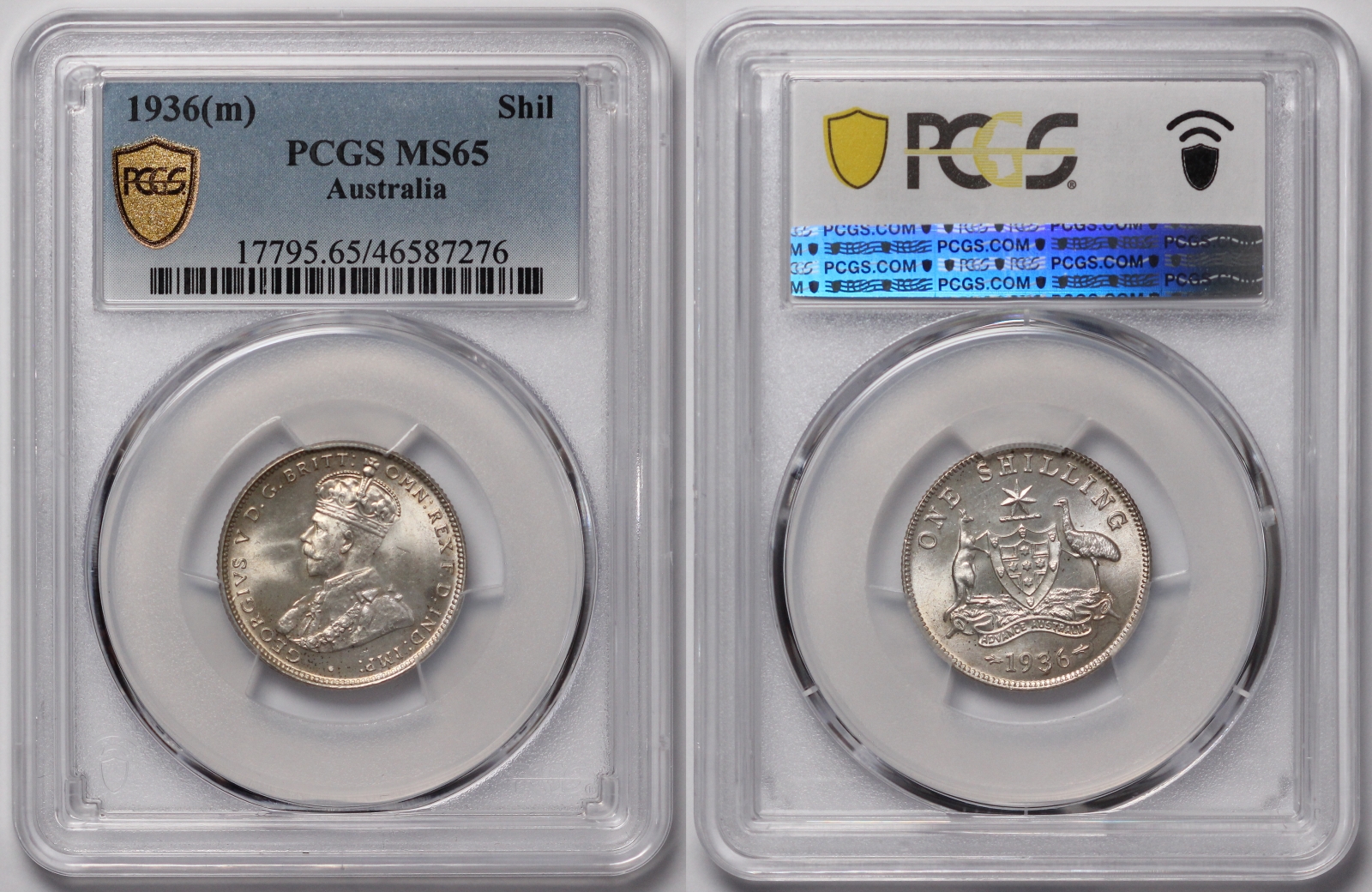 Australia 1936 George V Shilling 1/-. PCGS graded MS65 Gem Uncirculated. Scarce in this grade.