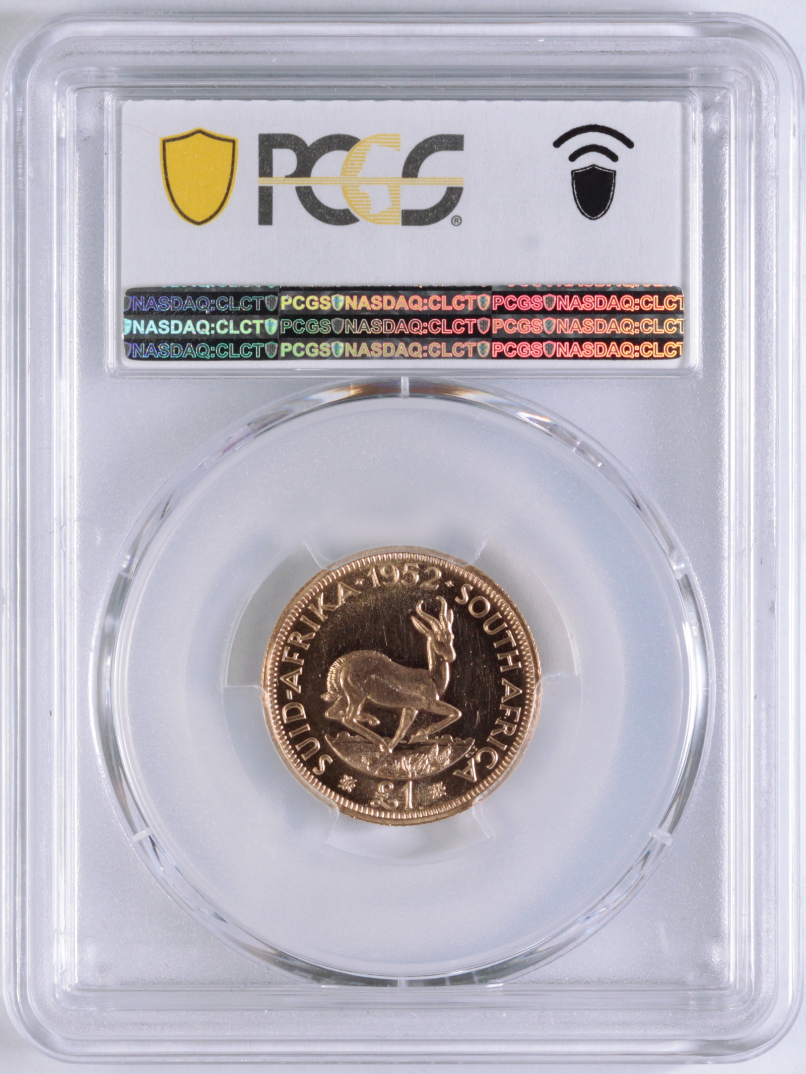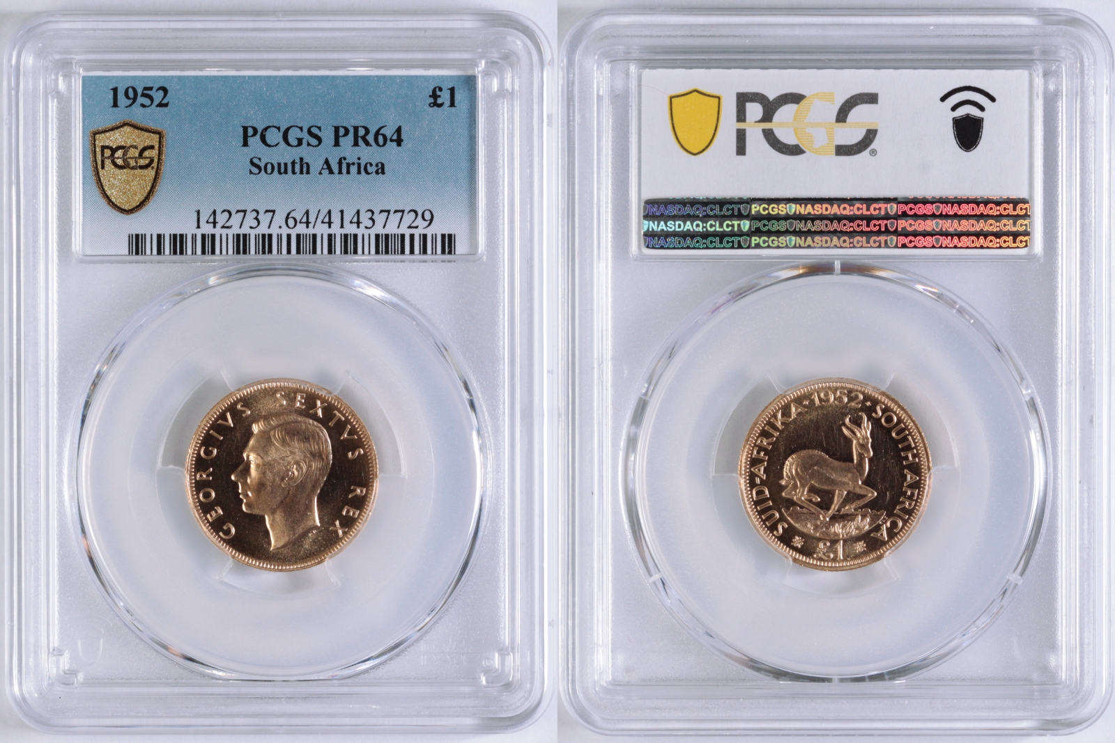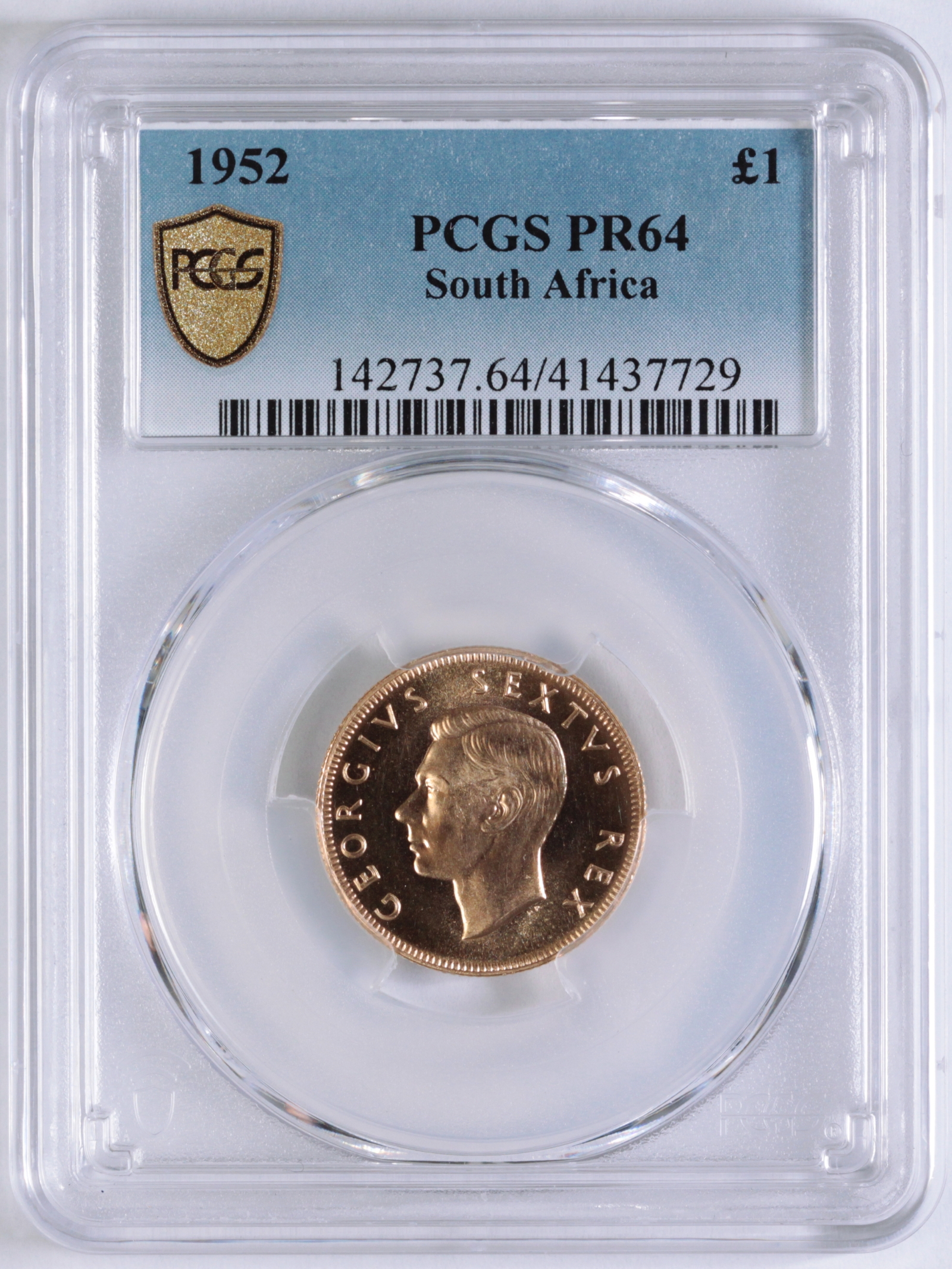 SOUTH AFRICA. 1 Pound, 1952. KM-43, one-year type with a low mintage of 12,000 pieces. PCGS graded PR64 Choice Proof.