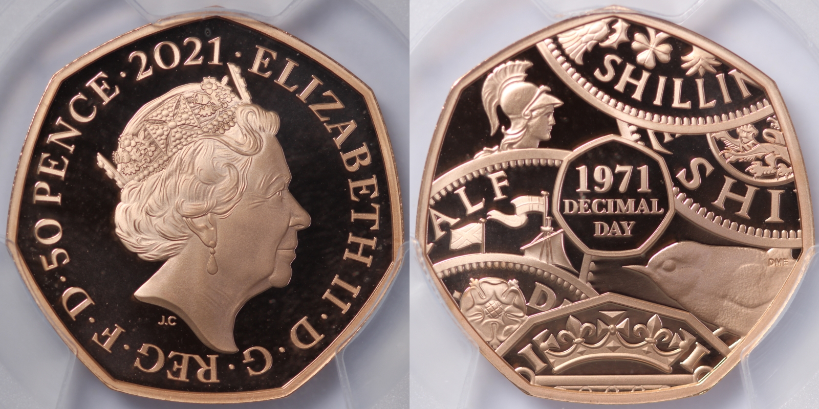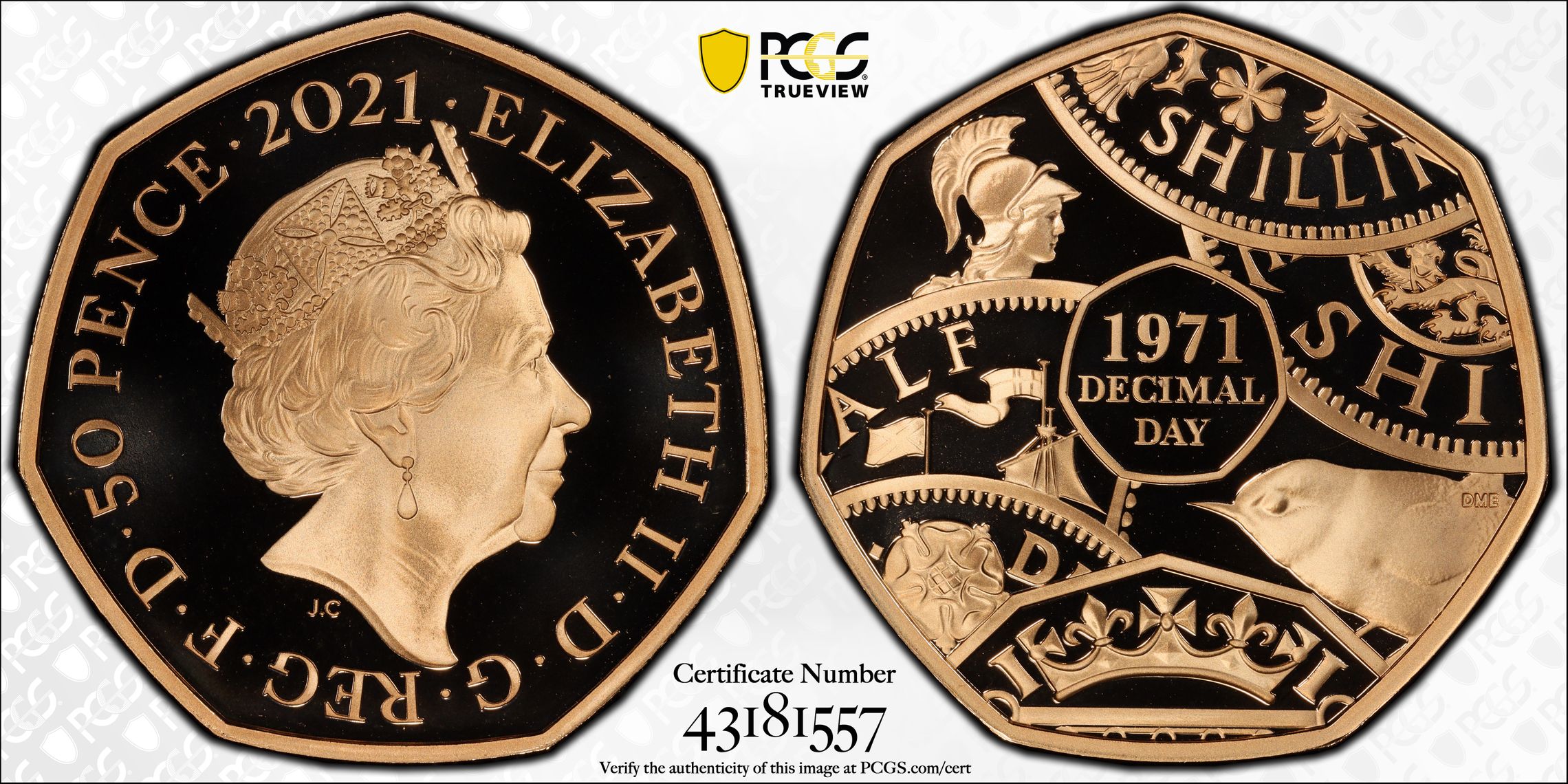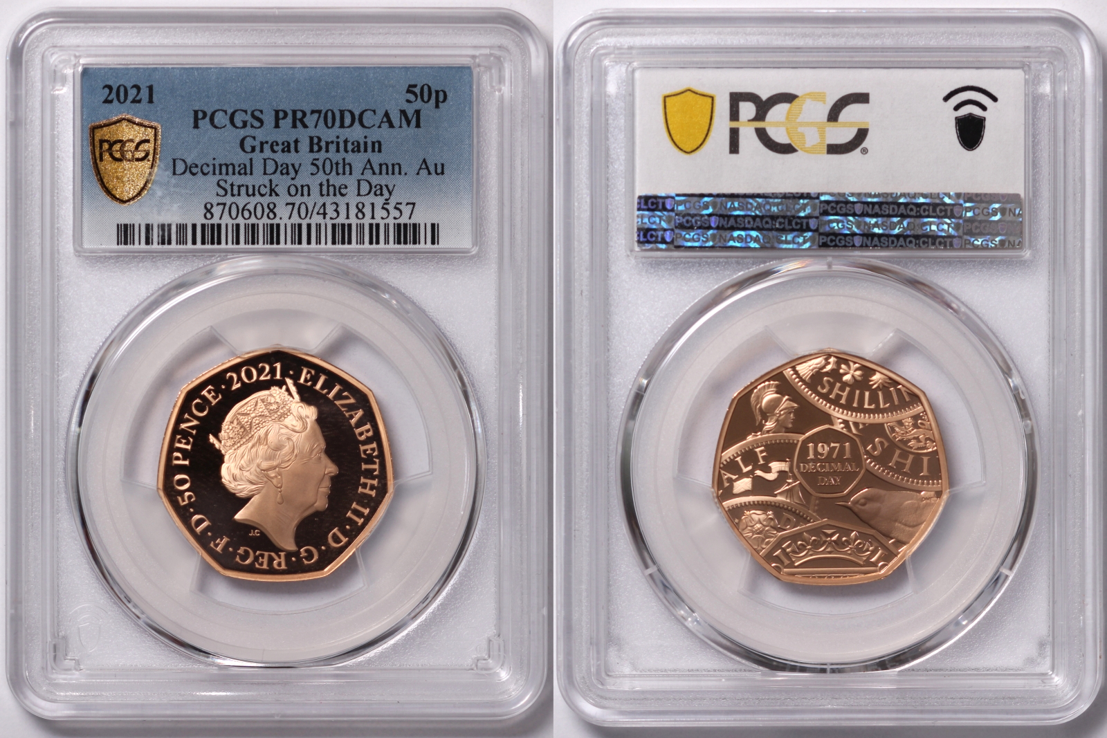 Great Britain 2021 50p 50th Anniversary of Decimal Day ‘Struck on the Day’ Gold Proof Coin. PCGS graded PR70DCAM.