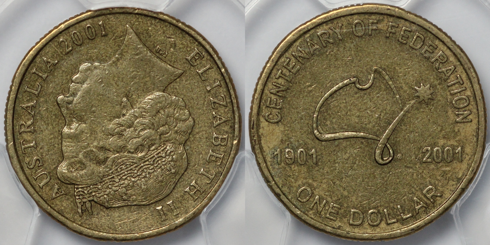 Australia 2001 $1 Centenary Of Federation. Rotated Die Upset 180° Error. PCGS graded XF40.