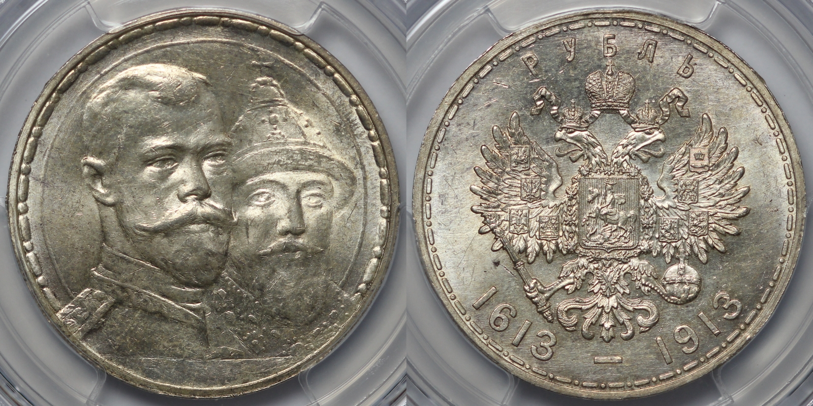Russian – Empire Rouble, 1913-BC. Bit-335 Low Relief. St. Petersburg Mint. Nicholas II. This issue commemorates 300 years of Romanov rule. With a mintage of 50,000, this low relief version is much rarer than the one in high relief. PCGS Graded MS63, equal-third finest graded by PCGS (Pop: 4/2).