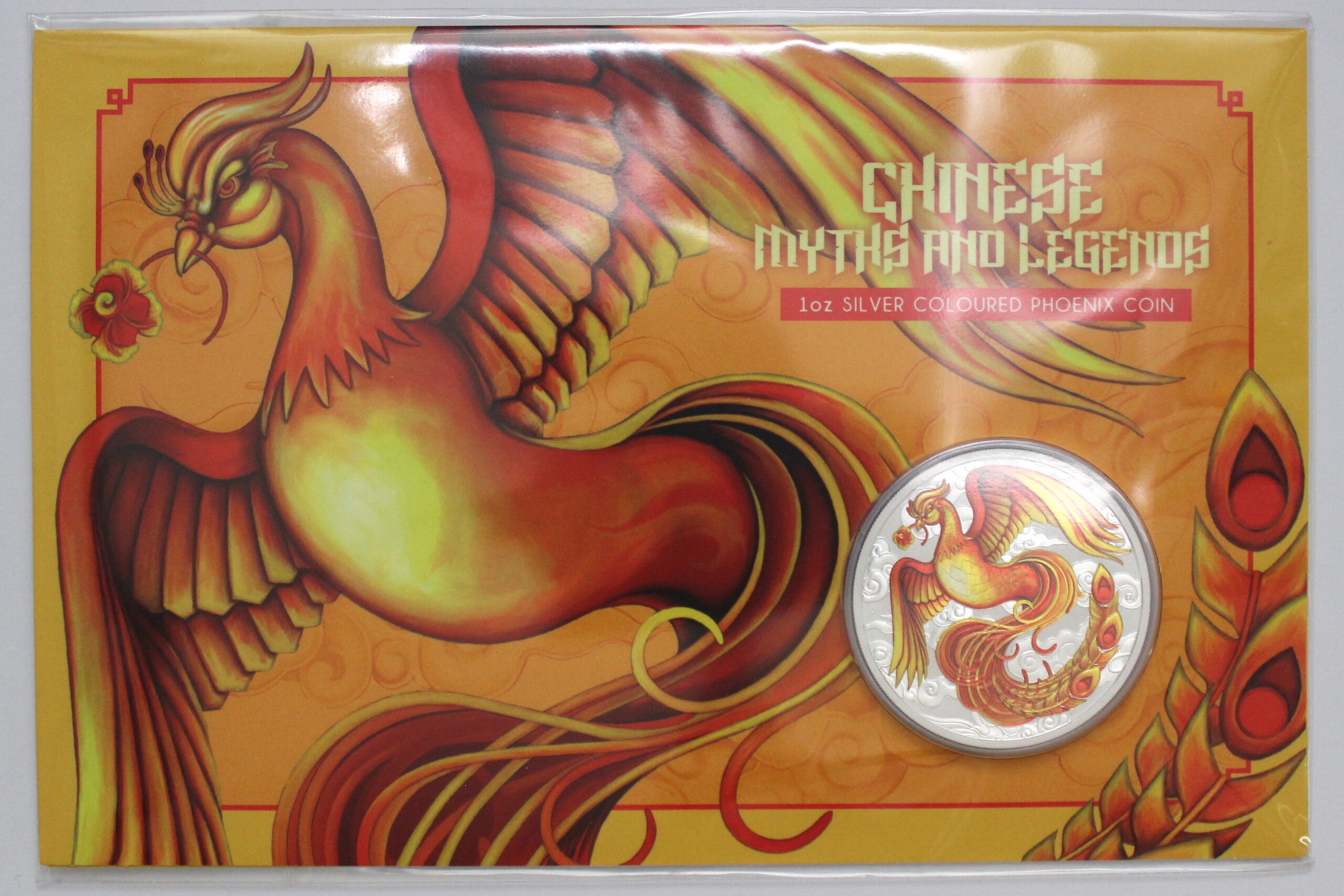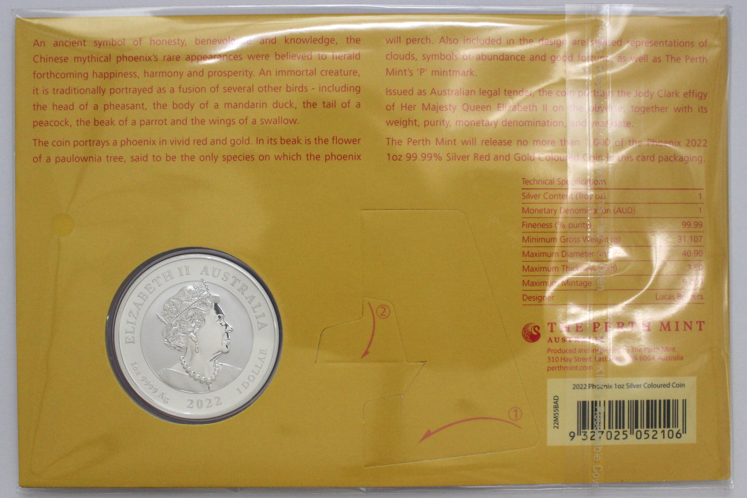 2022 $1 Chinese Myths and Legends Phoenix 1oz Silver Red & Gold Coloured Carded Coin.