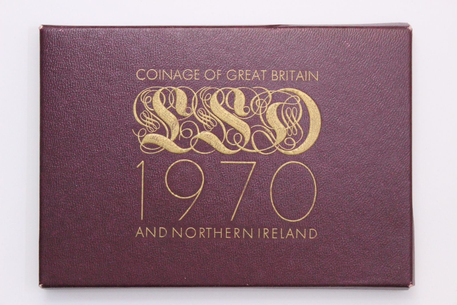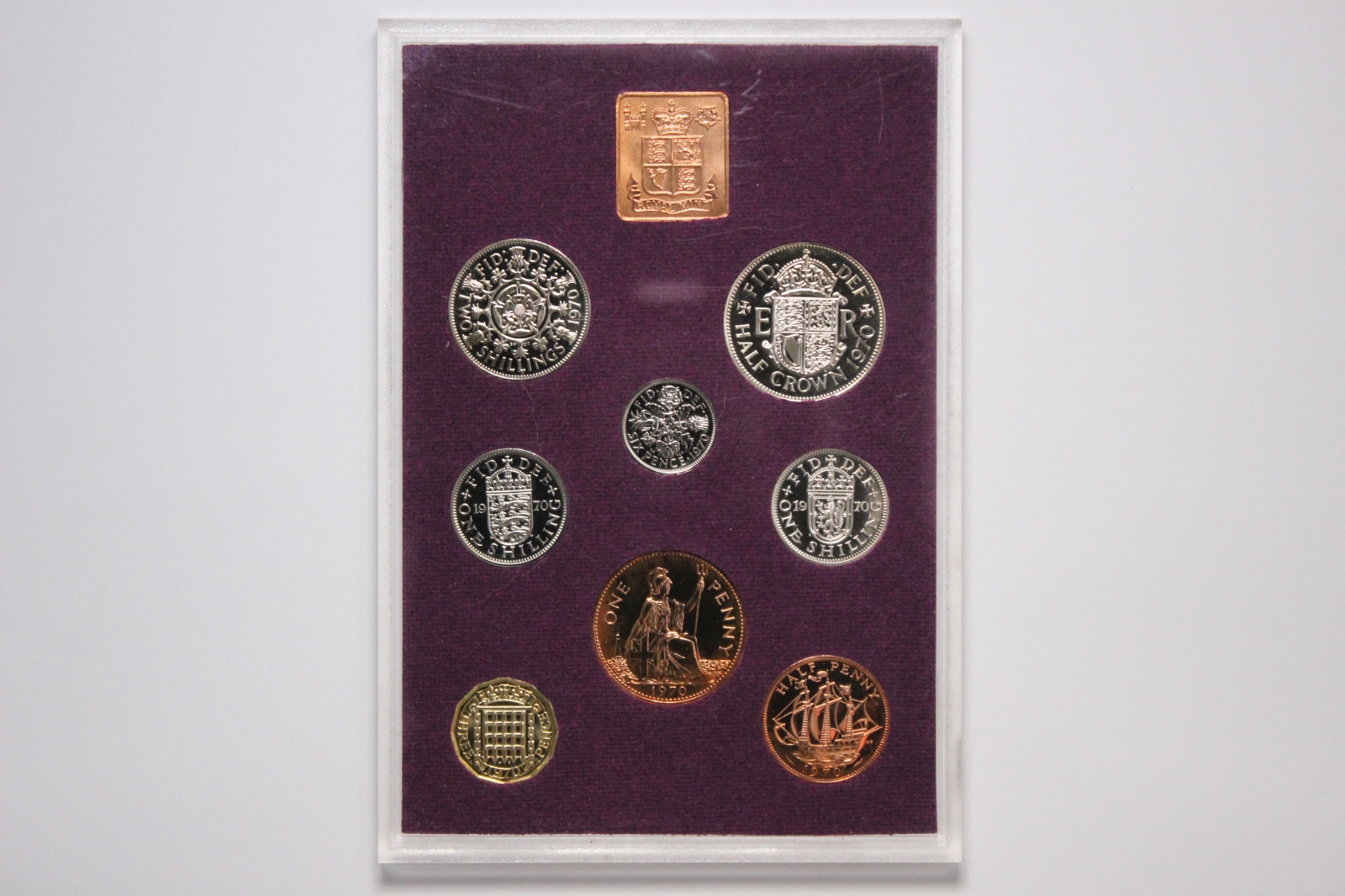 UK Royal Mint 1970 Coinage of Great Britain & Northern Ireland 8-Coin Proof Set. The coins are presented in a sealed plastic case with an outer card envelope.