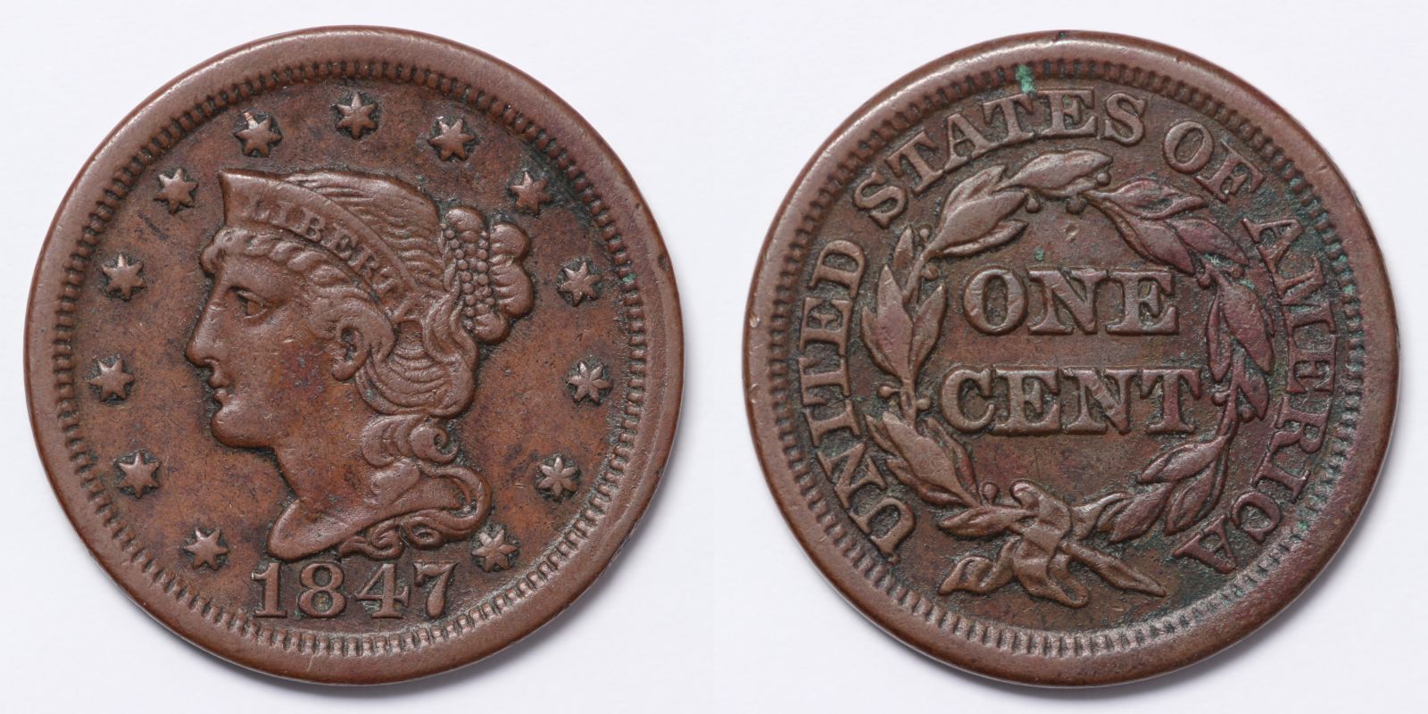 United States USA 1847 Liberty Braided Hair Large Cent 1C Copper Coin