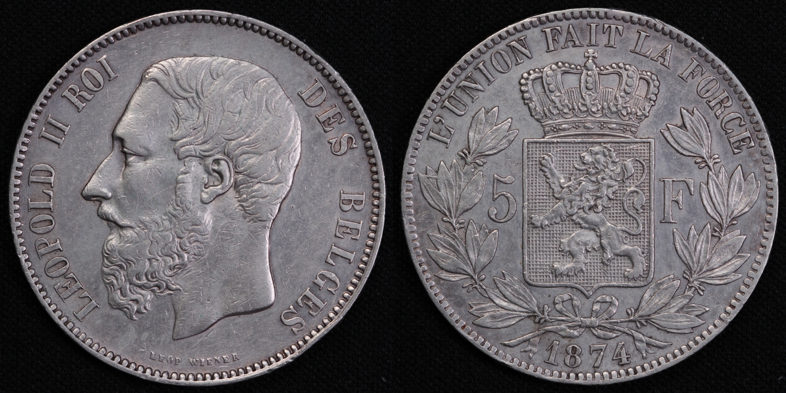 Belgium 1874 5 Francs Leopold II KM#24 World Silver Coin
